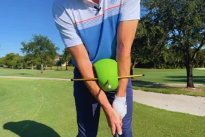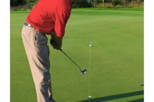 Benefit: Creating a one piece swing motion with no independent wrist hinging action allows the putter face to remain square to the swing path of the putter head throughout the entire swing motion. This naturally returns the putter face square to the aim line at the point of impact. “The Putting Stroke Teacher” provides instant and effective feed back to the golfer as the rod rests across the top of the forearms. If the golfer ads even the slightest amount of wrist hinging the rod will slide along the forearms providing instant feedback.